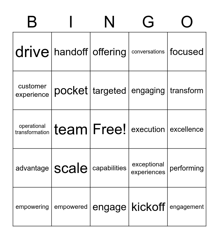This bingo card has a free space and 54 words: adapt, advantage, automation, behaviors, capabilities, compliment, conversations, creative, customer experience, customer success, drive, effort, empowered, empowering, enablement, engage, engagement, engaging, evolve, excellence, exceptional experiences, executing, execution, focused, globe, handoff, impacted, incremental, integration, kickoff, leadership team, massive, model, new doors, offering, onboarded, operational transformation, performing, playbook, pocket, pulse, reach out, recognize, reflect, scale, strategic, strategic element, system, targeted, team, transform, upskill, win and world class.