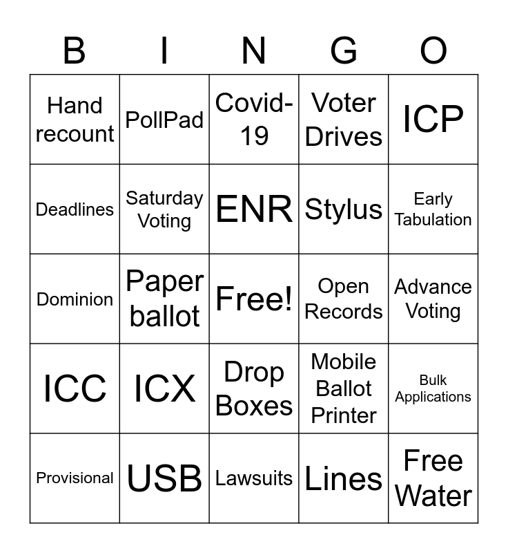 This bingo card has a free space and 30 words: USB, BMD, Paper ballot, Audit, Hand recount, Covid-19, Saturday Voting, Drop Boxes, Open Records, Lawsuits, Advance Voting, Free Water, Lines, Absentee Ballots, Early Tabulation, Batches, Mobile Ballot Printer, ICC, ICX, ICP, Dominion, KnowInk, PollPad, Stylus, Deadlines, Voter Drives, Bulk Applications, Provisional, ENR and County Attorney.