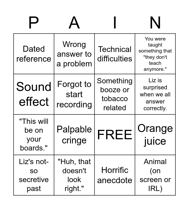 This bingo card has 21 words: "Huh, that doesn't look right.", Liz's Exes, Wrong answer to a problem, You actually learned something., Horrific anecdote, Something booze or tobacco related, Dated reference, Technical difficulties, FREE, Liz is surprised when we all answer correctly., "This will be on your boards.", You were taught something that "they don't teach anymore.", Animal (on screen or IRL), "Previous students have struggled with this.", Forgot to start recording, Unrelated tangent, Liz's not-so secretive past, Palpable cringe, Sound effect, Orange juice and Midwestern dialect.