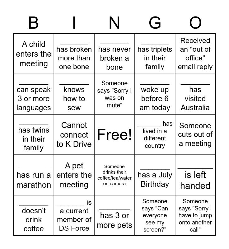 This bingo card has a free space and 27 words: _______ has a July Birthday, _______ has worked at Peel for 10+ years, _______ woke up before 6 am today, _______ has 3 or more pets, _______ can speak 3 or more languages, _______ has never broken a bone, _______ has broken more than one bone, _______ has run a marathon, _______ has lived in a different country, _______ is left handed, _______ has twins in their family, _______ has triplets in their family, _______ doesn't drink coffee, _______ is a current member of DS Force, _______ has visited Australia, _______ knows how to code, _______ knows how to sew, Someone says "Sorry I was on mute", A pet enters the meeting, A child enters the meeting, Someone cuts out of a meeting, Someone says "Can everyone see my screen?", Cannot connect to K Drive, Someone says "Sorry I have to jump onto another call", Someone drinks their coffee/tea/water on camera, Received an "out of office" email reply and Make yourself a work cocktail.
