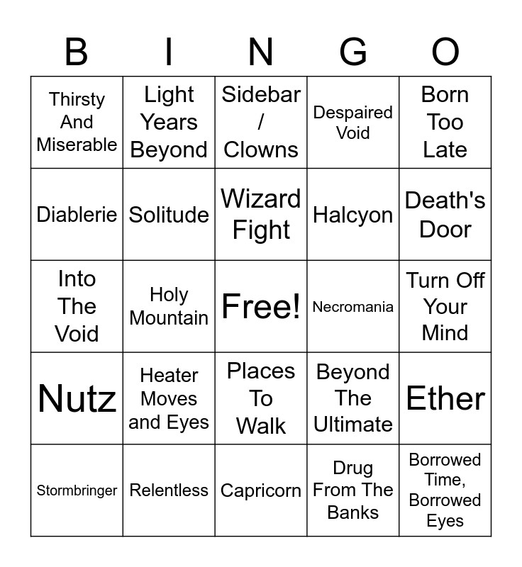This bingo card has a free space and 40 words: Black Sabbath, Into The Void, Sweet Leaf, Solitude, Relentless, Places To Walk, Wizard Fight, Greenthumb, Born Too Late, Nutz, Holy Mountain, Despaired Void, Borrowed Time, Borrowed Eyes, Turn Off Your Mind, Necromania, Heater Moves and Eyes, Genesis, Thirsty And Miserable, Doom's Bride, Sidebar / Clowns, Ether, Drug From The Banks, Halcyon, Diablerie, Run The Night, Freya, Doom Over the World, Bewitched, Existence is Punishment, Seer, The Yeti, Stormbringer, Forever Black, Beyond The Ultimate, Death's Door, Capricorn, One Nation, Shallow Water, Light Years Beyond and Pride.