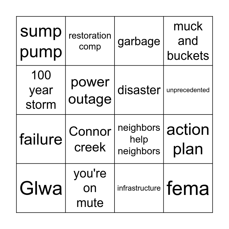 This bingo card has 16 words: you're on mute, action plan, garbage, sump pump, failure, restoration comp, neighbors help neighbors, infrastructure, 100 year storm, power outage, Glwa, muck and buckets, Connor creek, unprecedented, disaster and fema.
