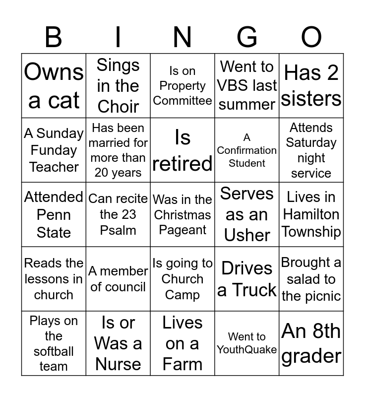 This bingo card has 25 words: A member of council, Lives on a Farm, Is retired, Plays on the softball team, Has 2 sisters, Owns a cat, A Sunday Funday Teacher, Sings in the Choir, Serves as an Usher, Is going to Church Camp, A Confirmation Student, Attended Penn State, Drives a Truck, Brought a salad to the picnic, Has been married for more than 20 years, An 8th grader, Lives in Hamilton Township, Is on Property Committee, Attends Saturday night service, Can recite the 23 Psalm, Was in the Christmas Pageant, Is or Was a Nurse, Reads the lessons in church, Went to VBS last summer and Went to YouthQuake.