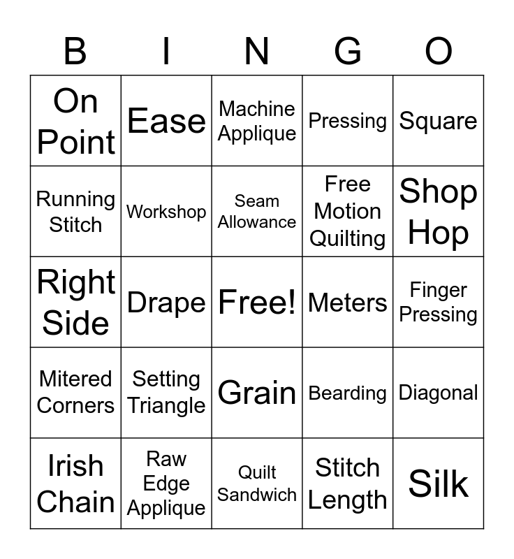 This bingo card has a free space and 145 words: 1/4" Seam, Applique, Asymmetrical Designs, Backstitch, Basting, Bearding, Bias, Bias Binding, Big Stitch, Binding, Blanket Stitch, Blindstitch, Chain Piecing, Color vs Value, Complementary Colors, Couching, Creative, Cross-Hatching, Crosswise Grain, Cutting, Decorative Stitches, Diagonal, Directional Borders, Dog-Ear, Double Applique Method, Drape, Ease, Echo Quilting, Embellishment, Embroidery, English Paper Piecing, Fabric Grain, Fabriholic, Finger Pressing, Finished Size, Floating Blocks, Foundation Paper Piecing, Foundation Piecing, Free Motion Quilting, Freemotion Embroidery, Frog Stitching, Fussy Cut, Grain, Grid, Hand Piecing, Hand Quilting, Hanging Sleeve, HST, Improvisational, In The Ditch Quilting, Inches, Interfacing, Irish Chain, Ironing Vs Pressing, King, Label, Lace, Lap Quilt, Loft, Longarm Quilting, Machine Applique, Machine Piecing, Machine Quilting, Matching Points, Measure, Meters, Mitered Corners, Modern, Motif, Needle Turn Applique, Negative Space, Novelty Print, On Point, Paper Piecing, Partial Seams, Patchwork, Pieced Border, Piecing, Pin Baste, Pressing, Primary Colors, QST, Quarter Inch, Queen, Quilt, Quilt As You Go, Quilt Bee, Quilt Guild, Quilt Label, Quilt Sandwich, Quilt Shows, Quilt Sleeve, Quilt Top, Quilting Cotton, Raw Edge Applique, Red Work, Reproduction Fabrics, Retreat, Right Side, Round Robin, Row By Row, Running Stitch, Sashing, Scrappy, Scrim, Seam Allowance, Seams, Selvedge, Serger, Set In Corners, Setting The Seam, Setting Triangle, Sewing, Shop Hop, Shrinkage, Silk, Square, Squaring Up, Stab Stitching, Stash, Stay Stitch, Stippling, Stitch, Stitch In The Ditch, Stitch Length, Straight Grain, String Piecing, Strip Piecing, Strip Set, Tension, Thimble, Thread, Top Stitch, Trapunto, Triangles, UFO, Vintage, Wide Back, Width Of Fabric (WOF), Wool, Workshop, WOW, Wrong Side, Yard and Yardage.
