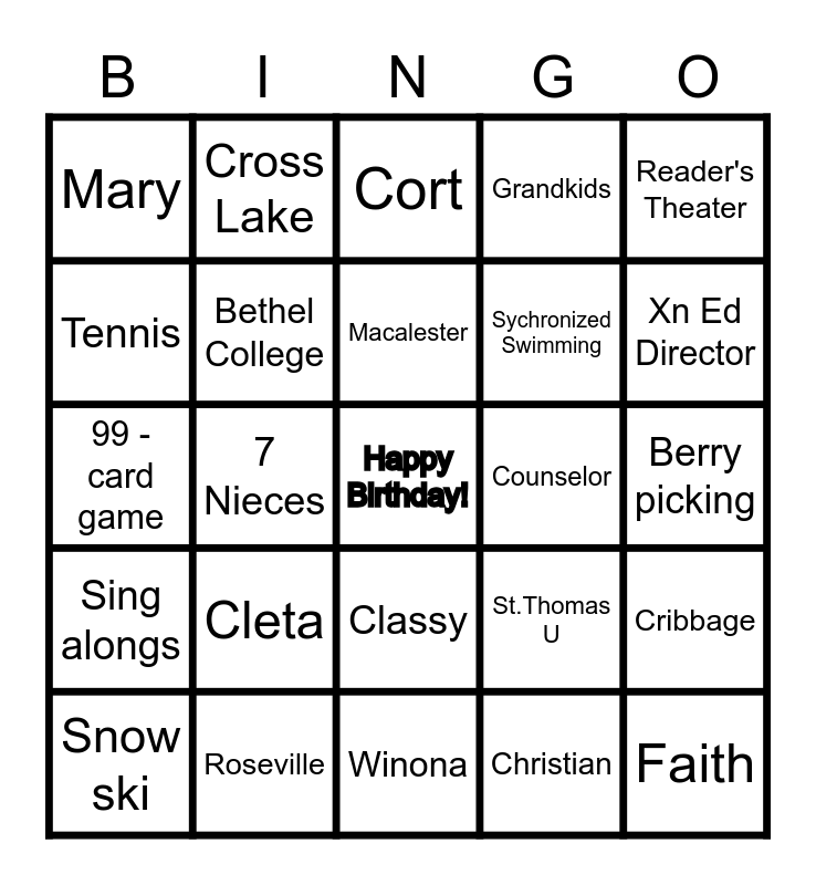 This bingo card has a free space and 77 words: Carol, Doris, Cort, Erika, Harry, Helen, Strane, Anderson, Charles, Waterski, Snow ski, Canoe, Counselor, Xn Ed Director, Kindergarten Teacher, Bethel College, Camping, St.Thomas U, Glacier Park, Tennis, Global Harmony, Macalester, Sychronized Swimming, Reader's Theater, Mary, Girl Scout leader, Central Presbyterian, Halifax, Washington DC, California, Florida, Mexico, Beachball Volleyball, Cribbage, 99 - card game, Cross Lake, Arizona, Hiking, Berry picking, Sing alongs, Ukelele, Madeline Island, Calligraphy, St. Paul, Falcon Heights, Roseville, Piano, Grandkids, Great Grandkids, Twins Baseball, Vikings Football, Winona, Biking with baby Jon, Bowling, Bridge (cards), Knitting, Golf, St.Paul Pioneer Press, Trienniem -Purdue, Elder (church), 7 Nieces, Crochet, So many friends, So much love, Sweet potato vine, Flowers, 9 Nephews, Christian, Faith, Laugh, Caring, Classy, Pray, Listening, Bruce, Cleta and Sidney.