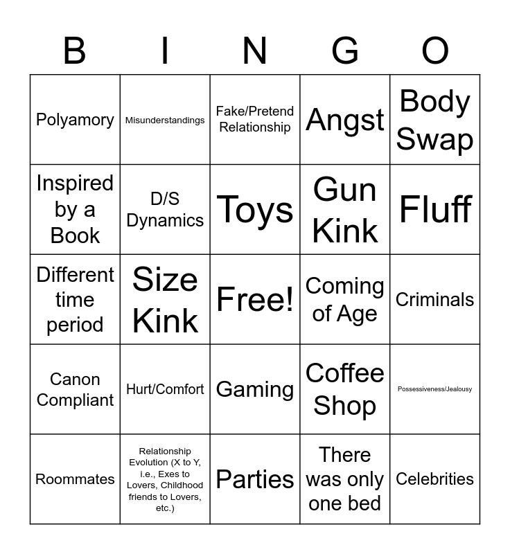 This bingo card has a free space and 24 words: Hurt/Comfort, Relationship Evolution (X to Y, i.e., Exes to Lovers, Childhood friends to Lovers, etc.), Toys, Roommates, Body Swap, Polyamory, Inspired by a Book, Misunderstandings, Coming of Age, Gaming, Gun Kink, Different time period, Coffee Shop, Possessiveness/Jealousy, D/S Dynamics, There was only one bed, Criminals, Fake/Pretend Relationship, Fluff, Size Kink, Celebrities, Canon Compliant, Angst and Parties.