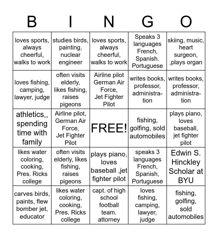 This bingo card has a free space and 24 words: often visits elderly, likes fishing, raises pigeons, likes water coloring, cooking, Pres. Ricks college, Airline pilot German Air Force, Jet Fighter Pilot, carves birds, paints, flew bomber jet, educator, skiing, music, heart surgeon, ,plays organ, loves sports, always cheerful, walks to work, loves fishing, camping, lawyer, judge, studies birds, painting, nuclear engineer, fishing, golfing, sold automobiles, plays piano, loves baseball ,jet fighter pilot, writes books, professor, administra- tion, athletics,, spending time with family, speaks 3 languages French, Spanish, Portuguese, Edwin S. Hinckley Scholar at BYU, often visits elderly, likes fishing, raises pigeons, loves fishing, camping, lawyer, judge, plays piano, loves baseball, jet fighter pilot, loves sports, always cheerful, walks to work, writes books, professor, administra-tion, Airline pilot, German Air Force, Jet Fighter Pilot, fishing, golfing, sold automobiles, likes water coloring, cooking, Pres. Ricks college, Speaks 3 languages French, Spanish. Portuguese and capt. of high school football team. attorney.