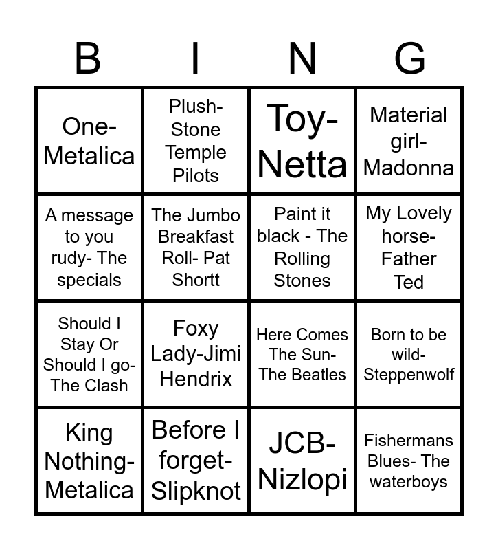 This bingo card has 36 words: Seven Nation Army- White Stripes, Feeling Good- Nina Simone, Bulls on Parade- Rage against the machine, Paint it black - The Rolling Stones, Sweet Caroline- Neil Diamond, Fishermans Blues- The waterboys, My Lovely horse- Father Ted, We Will Rock you- Queen, A message to you rudy- The specials, Virtual insanity- Jamiroquai, Born to be wild- Steppenwolf, Material girl- Madonna, Rocky Road To Dublin- The Dubliners, Before I forget-Slipknot, Foxy Lady-Jimi Hendrix, One-Metalica, I'm a believer- The Monkees, Lovely day trip-Bill Withers, King Nothing- Metalica, Toy-Netta, JCB- Nizlopi, Can't stop- Red Hot Chilli Peppers, Silk City- Dua Lipa, 1979- Smashing Pumpkins, Spoonman- Soundgarden, Plush- Stone Temple Pilots, Here Comes The Sun- The Beatles, Do It Again- The Chemical Brothers, Should I Stay Or Should I go- The Clash, The Jumbo Breakfast Roll- Pat Shortt, Adagio For Strings- Tiesto, Level Of Concern- Twenty One Pilots, Wonderwall - Oasis, I wanna be your slave- Maneskin, Heartbreak anthem- David Guetta and Save your tears- The weekend.