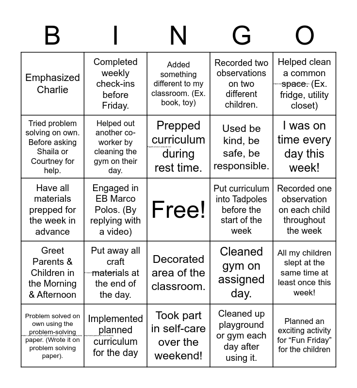 This bingo card has 5 images, a free space and 24 words: Put away all craft materials at the end of the day., Implemented planned curriculum for the day, Prepped curriculum during rest time., Problem solved on own using the problem-solving paper. (Wrote it on problem solving paper)., Helped clean a common space. (Ex. fridge, utility closet), Emphasized Charlie, Tried problem solving on own. Before asking Shaila or Courtney for help., Completed weekly check-ins before Friday., Put curriculum into Tadpoles before the start of the week, Decorated area of the classroom., Used be kind, be safe, be responsible., Have all materials prepped for the week in advance, Cleaned gym on assigned day., All my children slept at the same time at least once this week!, Helped out another co-worker by cleaning the gym on their day., Cleaned up playground or gym each day after using it., Recorded one observation on each child throughout the week, Added something different to my classroom. (Ex. book, toy), I was on time every day this week!, Engaged in EB Marco Polos. (By replying with a video), Planned an exciting activity for “Fun Friday” for the children, Greet Parents & Children in the Morning & Afternoon, Recorded two observations on two different children. and Took part in self-care over the weekend!.