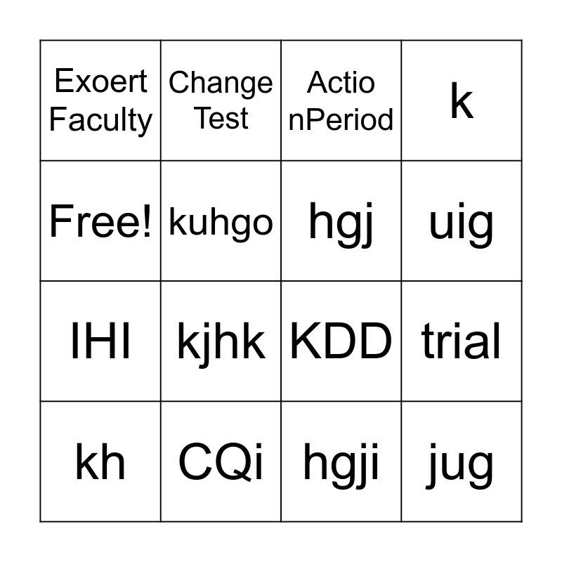 This bingo card has 16 words: CQi, trial, Actio nPeriod, Exoert Faculty, IHI, Change Test, KDD, hgji, Free!, kuhgo, kh, k, kjhk, uig, hgj and jug.