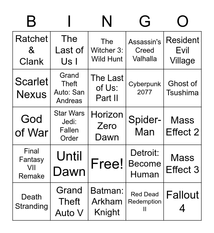This bingo card has 26 words: Free!, Red Dead Redemption II, The Last of Us: Part II, Grand Theft Auto V, Resident Evil Village, Ratchet & Clank, Scarlet Nexus, The Last of Us I, Mass Effect 2, Detroit: Become Human, Cyberpunk 2077, God of War, Mass Effect 3, Death Stranding, Star Wars Jedi: Fallen Order, Mass Effect, Assassin's Creed Valhalla, Final Fantasy VII Remake, The Witcher 3: Wild Hunt, Horizon Zero Dawn, Ghost of Tsushima, Batman: Arkham Knight, Spider-Man, Until Dawn, Grand Theft Auto: San Andreas and Fallout 4.