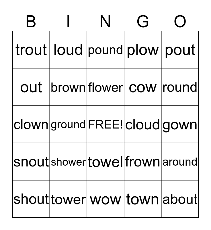 This bingo card has a free space and 24 words: shower, tower, flower, shout, pout, trout, out, loud, cloud, towel, cow, clown, frown, around, brown, town, gown, pound, round, ground, about, snout, plow and wow.