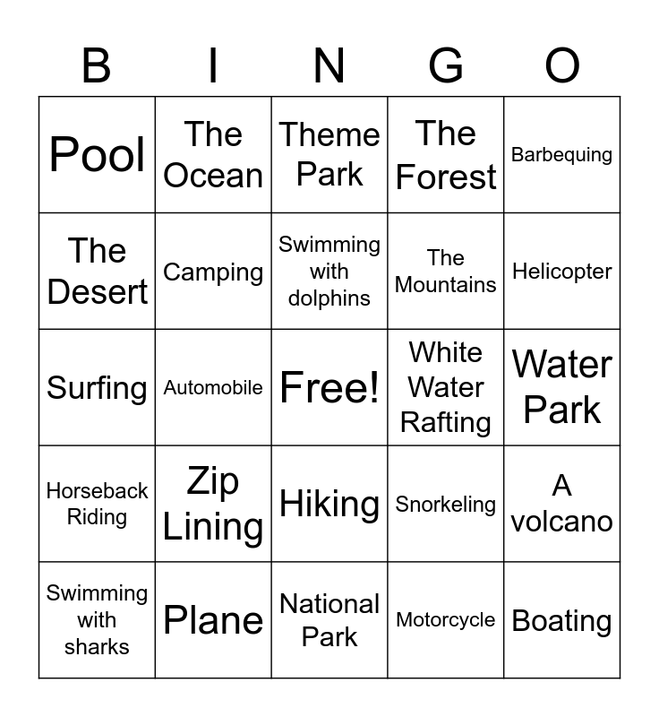 This bingo card has a free space and 30 words: Plane, Train, Automobile, Beach, Pool, Theme Park, Camping, Hiking, White Water Rafting, National Park, Water Park, Boating, Motorcycle, Cruise, Helicopter, Diving, Snorkeling, Horseback Riding, Zip Lining, Barbequing, Surfing, The Lake, The Ocean, The Mountains, The Desert, The Forest, A volcano, Swimming with sharks, Swimming with dolphins and Kayaking.