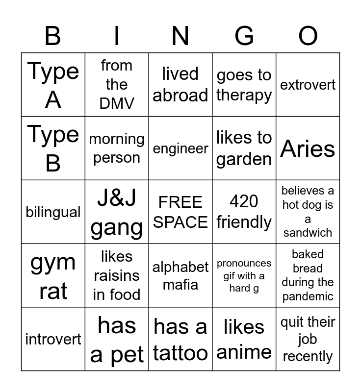 This bingo card has a free space and 24 words: likes raisins in food, has a pet, engineer, introvert, extrovert, Type A, Type B, from the DMV, 420 friendly, alphabet mafia, likes to garden, bilingual, pronounces gif with a hard g, baked bread during the pandemic, morning person, likes anime, believes a hot dog is a sandwich, lived abroad, Aries, J&J gang, quit their job recently, gym rat, goes to therapy and has a tattoo.