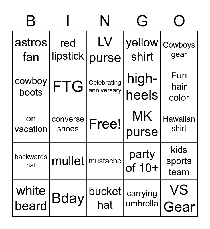 This bingo card has a free space and 24 words: mullet, Bday, Celebrating anniversary, white beard, Cowboys gear, astros fan, cowboy boots, red lipstick, MK purse, mustache, high-heels, on vacation, party of 10+, kids sports team, FTG, carrying umbrella, Hawaiian shirt, LV purse, Fun hair color, converse shoes, VS Gear, backwards hat, yellow shirt and bucket hat.