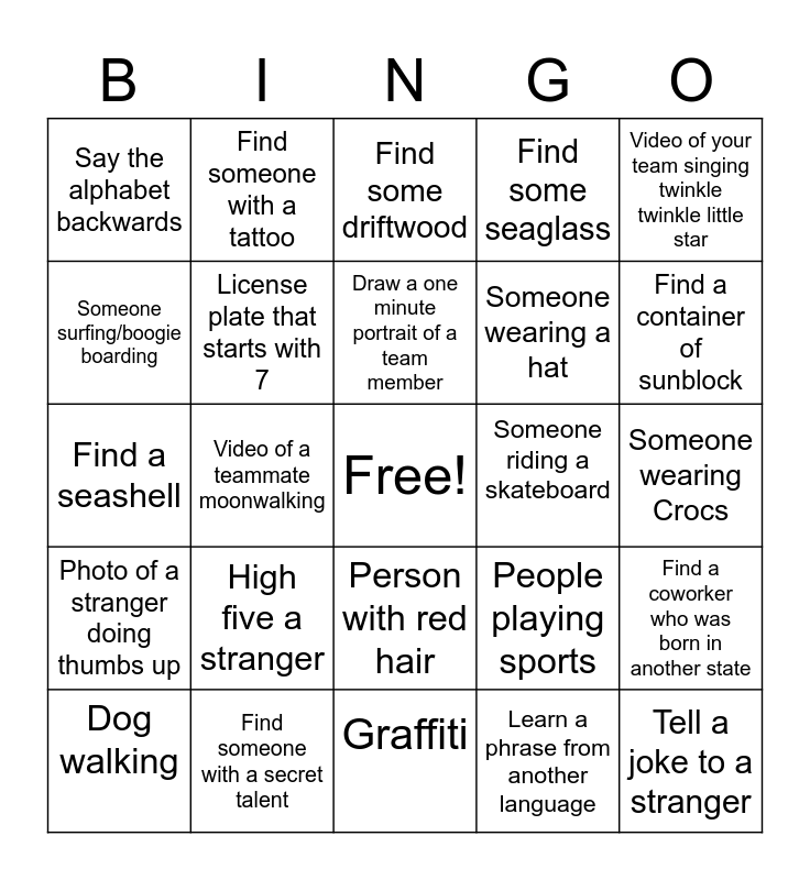 This bingo card has a free space and 24 words: Dog walking, High five a stranger, Draw a one minute portrait of a team member, Learn a phrase from another language, Video of your team singing twinkle twinkle little star, Say the alphabet backwards, Find someone with a tattoo, Find some driftwood, Someone riding a skateboard, Someone wearing Crocs, Find a seashell, License plate that starts with 7, People playing sports, Find a coworker who was born in another state, Someone surfing/boogie boarding, Find someone with a secret talent, Graffiti, Find some seaglass, Find a container of sunblock, Photo of a stranger doing thumbs up, Video of a teammate moonwalking, Person with red hair, Someone wearing a hat and Tell a joke to a stranger.