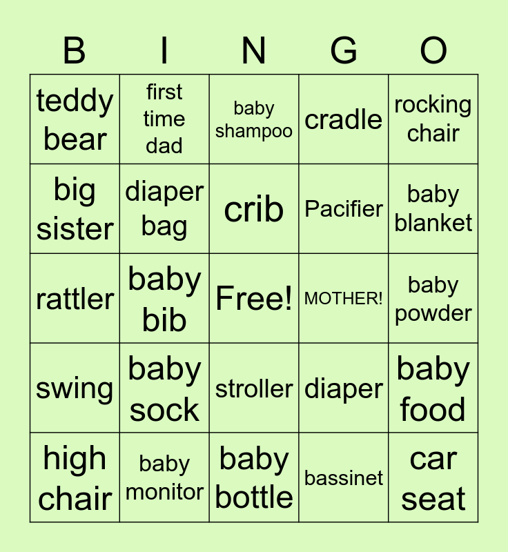 This bingo card has a free space and 25 words: baby sock, baby bottle, crib, high chair, rocking chair, teddy bear, big sister, first time dad, MOTHER!, stroller, Pacifier, rattler, diaper, baby food, diaper bag, diaper bag, baby powder, baby shampoo, baby blanket, baby bib, car seat, baby monitor, swing, cradle and bassinet.