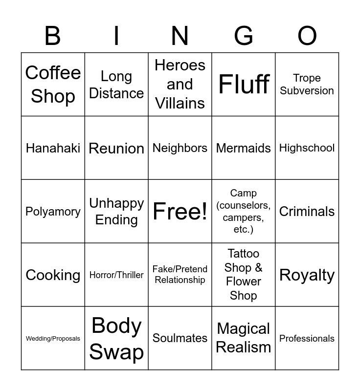 This bingo card has a free space and 24 words: Horror/Thriller, Body Swap, Neighbors, Wedding/Proposals, Trope Subversion, Coffee Shop, Hanahaki, Long Distance, Camp (counselors, campers, etc.), Fake/Pretend Relationship, Mermaids, Polyamory, Tattoo Shop & Flower Shop, Royalty, Reunion, Magical Realism, Criminals, Heroes and Villains, Highschool, Unhappy Ending, Professionals, Cooking, Fluff and Soulmates.