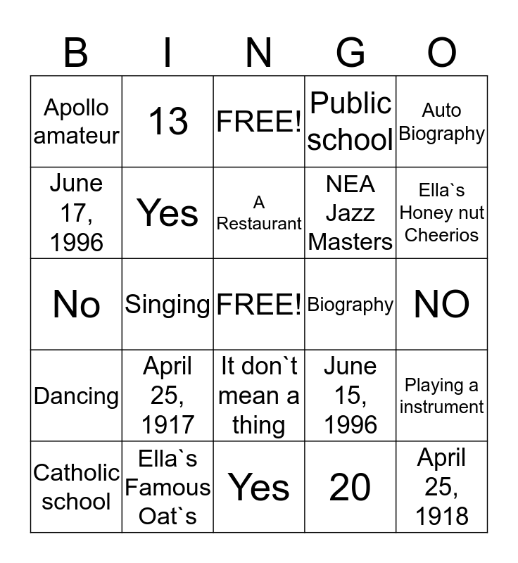 This bingo card has a free space and 24 words: April 25, 1917, Ella`s Famous Oat`s, A Restaurant, Catholic school, Auto Biography, Apollo amateur, June 17, 1996, 13, Biography, It don`t mean a thing, NEA Jazz Masters, No, June 15, 1996, Playing a instrument, Yes, 20, NO, FREE!, Ella`s Honey nut Cheerios, Singing, April 25, 1918, Dancing, Public school and Yes.