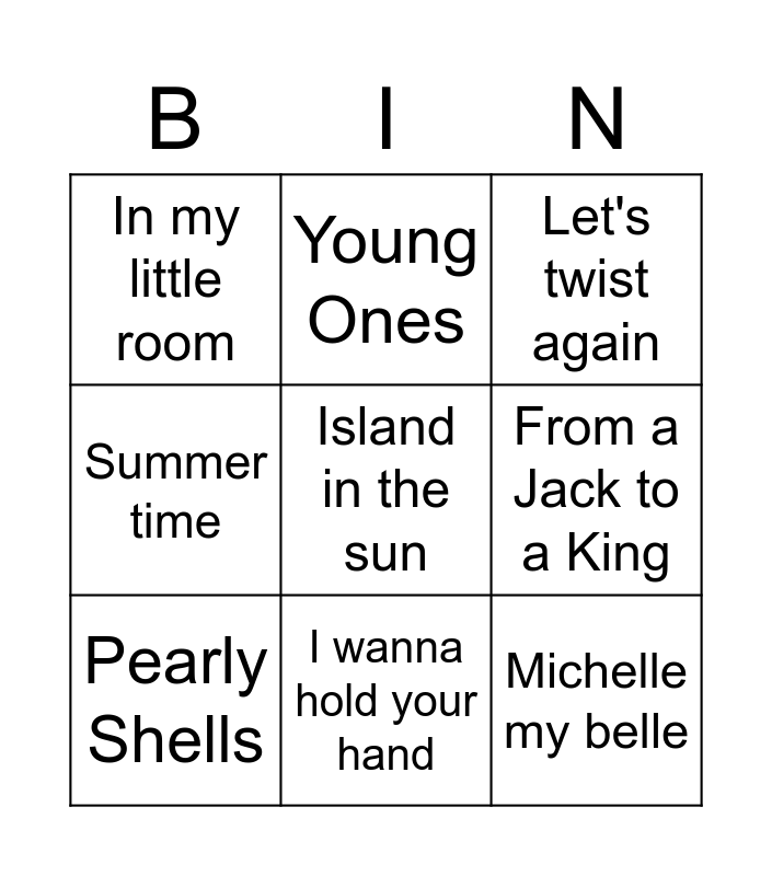 This bingo card has 18 words: Those were the days my friends, Daisy Daisy, Let's twist again, In my little room, Free!, Summer time, We're all going on a Summer Holiday, Young Ones, I wanna hold your hand, Michelle my belle, Brown girl in the ring, Island in the sun, Jailhouse Rock, From a Jack to a King, Pearly Shells, Island in the sun, King of the Road and Love Love me do.