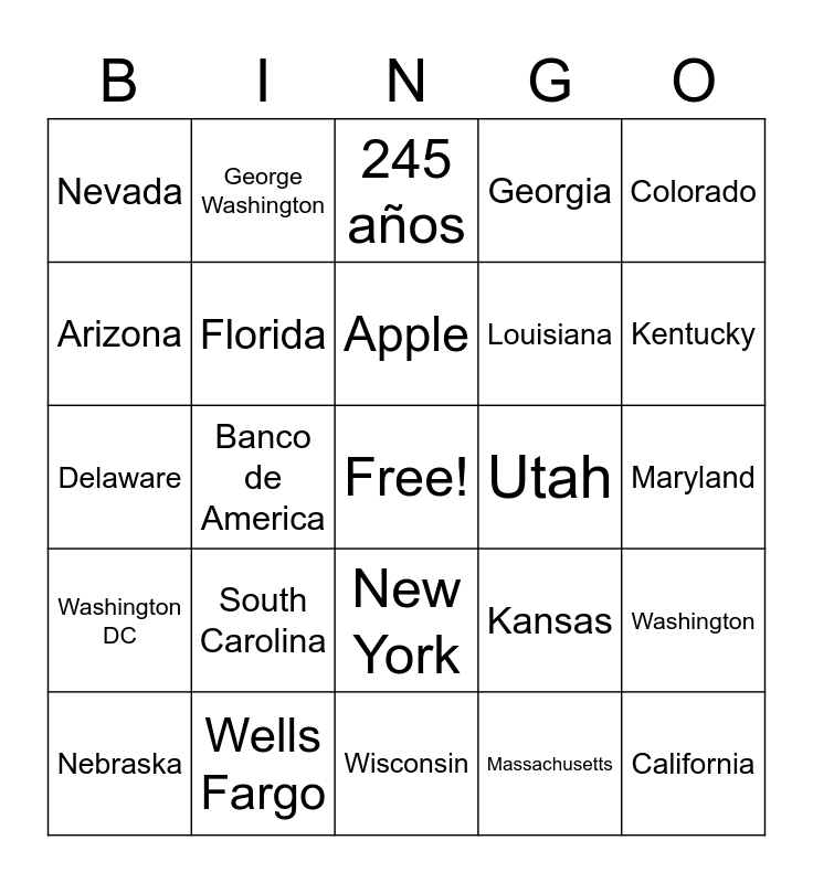 This bingo card has a free space and 75 words: 1776, 13 franjas, 245 años, 28 diseños, 331.5 millones, 38 años, 4 de julio, 50 estrellas, 82 kg, Alabama, Alaska, Amazon, Apple, Arizona, Arkansas, Banco de America, Best Western, California, Chick-fil-A, Colorado, Connecticut, Delaware, Florida, George Washington, Georgia, hamburguesa, Hawaii, Hilton, Idaho, Illinois, Indiana, Iowa, JP Morgan, Kansas, Kentucky, Louisiana, Maine, Marriott, Maryland, Massachusetts, McDonald's, Michigan, Minnesota, Mississippi, Missouri, Montana, Nebraska, Nevada, New Hampshire, New Jersey, New Mexico, New York, North Carolina, North Dakota, Ohio, Oklahoma, Oregon, Pennsylvania, perro caliente, Rhode Island, South Carolina, South Dakota, Starbucks, Tennessee, Texas, Utah, Vermont, Virginia, Walmart, Washington, Washington DC, Wells Fargo, West Virginia, Wisconsin and Wyoming.