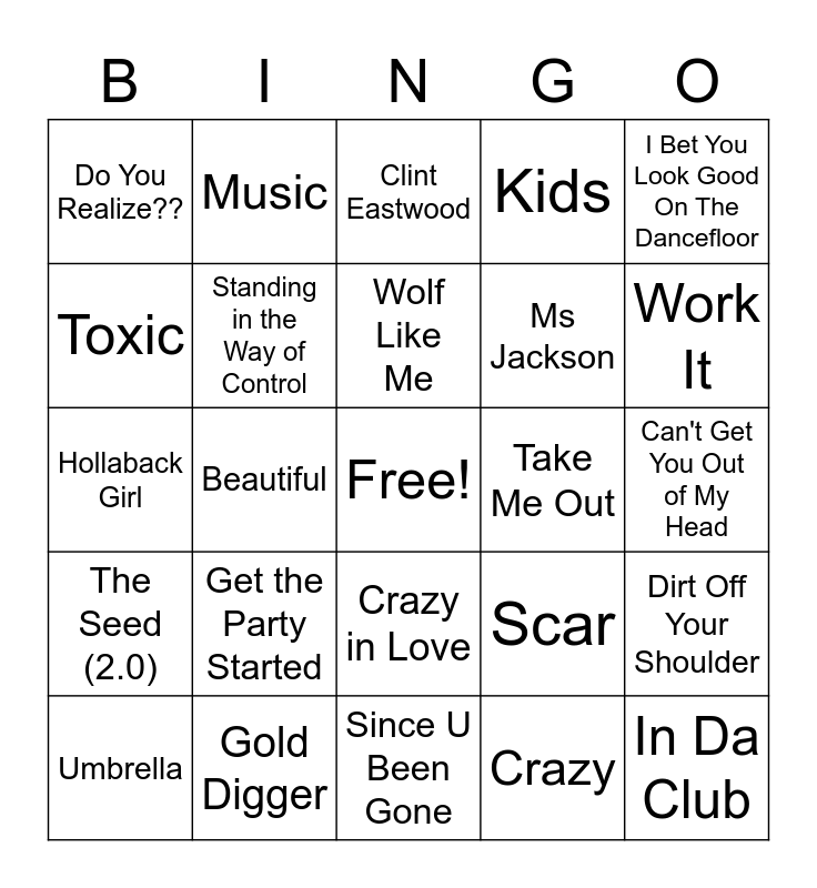 This bingo card has 38 words: Welcome to Jamrock, Poker Face, Drop It Like It's Hot, Standing in the Way of Control, Dirt Off Your Shoulder, Get the Party Started, Wolf Like Me, D.A.N.C.E, I Bet You Look Good On The Dancefloor, Ms Jackson, Beautiful, Kids, Free!, Can't Get You Out of My Head, Toxic, The Seed (2.0), Milkshake, Clint Eastwood, One More Time, Take Me Out, Do You Realize??, Gold Digger, Work It, Umbrella, Cry Me a River, Since U Been Gone, In Da Club, Stan, Rehab, Maps, Seven Nation Army, Crazy in Love, Crazy, Music, Rock DJ, Scar, Hollaback Girl and Sandstorm.