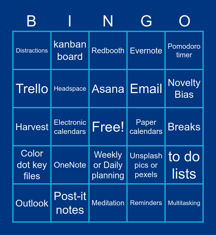 This bingo card has a free space and 24 words: OneNote, Post-it notes, Asana, Outlook, Pomodoro timer, Distractions, Trello, kanban board, Paper calendars, Weekly or Daily planning, Email, Harvest, Unsplash pics or pexels, to do lists, Headspace, Reminders, Breaks, Redbooth, Novelty Bias, Electronic calendars, Multitasking, Color dot key files, Evernote and Meditation.