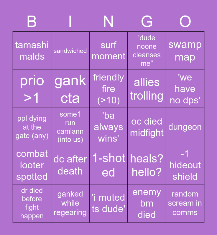 This bingo card has a free space and 24 words: dc after death, ganked while regearing, friendly fire (>10), dr died before fight happen, swamp map, tamashi malds, prio >1, sandwiched, oc died midfight, 1-shot ed, allies trolling, ppl dying at the gate (any), heals?hello?, -1 hideout shield, gank cta, enemy bm died, dungeon, surf moment, 'we have no dps', some1 run camlann (into us), random scream in comms, combat looter spotted, 'dude noone cleanses me" and 'i muted ts dude'.