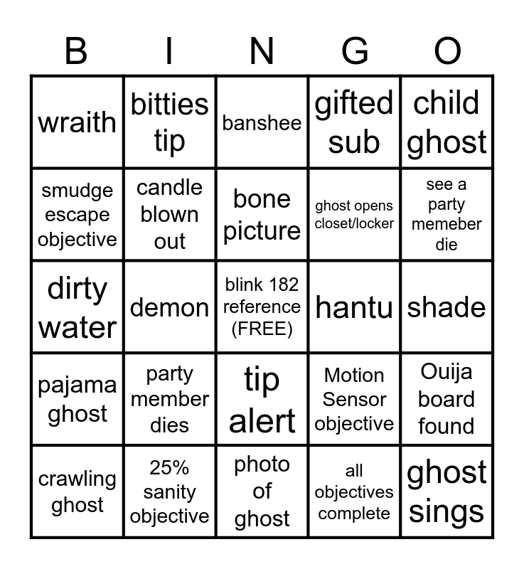 This bingo card has a free space and 24 words: crawling ghost, party member dies, bone picture, all objectives complete, child ghost, wraith, bitties tip, banshee, hantu, shade, dirty water, candle blown out, Motion Sensor objective, Ouija board found, smudge escape objective, 25% sanity objective, photo of ghost, gifted sub, see a party memeber die, pajama ghost, demon, tip alert, ghost opens closet/locker and ghost sings.