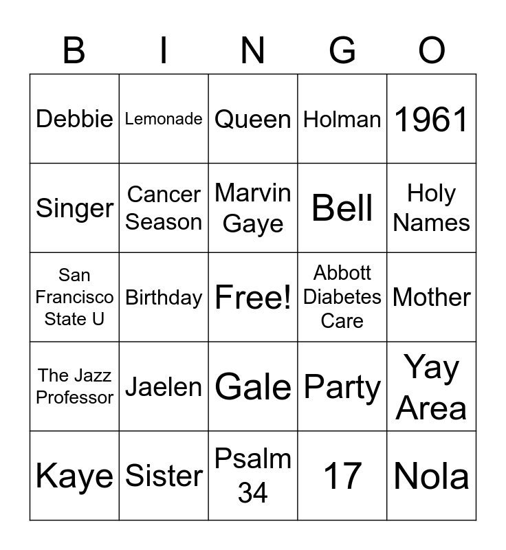 This bingo card has a free space and 29 words: Kaye, 60, Birthday, Jaelen, Debbie, Queen, Cancer Season, Jaelen, Abbott Diabetes Care, Sister, Mother, Nola, Psalm 34, 17, Holy Names, Waterloo, Gale, The Jazz Professor, 1961, San Francisco State U, Party, Friends, Bell, Singer, Holman, Lemonade, Yay Area, Marvin Gaye and Marathon.