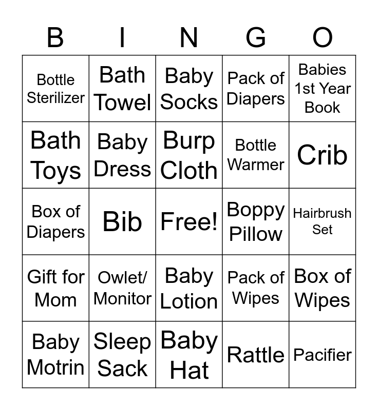 This bingo card has a free space and 29 words: Baby Motrin, Changing Pad, Bib, Swaddle Blanket, Bottle Sterilizer, Baby Socks, Baby Dress, Owlet/ Monitor, Boppy Pillow, Sleep Sack, Hairbrush Set, Pacifier, Baby Hat, Rattle, Crib, Swing, Baby Lotion, Gift for Mom, Babies 1st Year Book, Box of Diapers, Pack of Wipes, Bottle, Bottle Warmer, Bath Toys, Pack of Diapers, Bath Towel, Box of Wipes, Burp Cloth and Bath Tub.