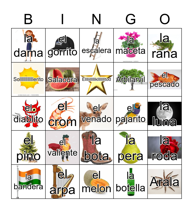 This bingo card has 43 images and 43 words: la campana, el venado, el cazo, la bandera, el barril, la botella, la escalera, la mano, la rana, el arpa, la maceta, el pajarito, la bota, el valiente, el nopal, el melon, la corona, el diablito, el tambor, el pescado, el gorrito, el corazon, la garza, la dama, la sirena, la luna, el musico, la palma, la pera, el pino, el gallo, la roda, el alacranyo, el crom, la calca, el solodad, Arala, Ellllillllllklllllllltod, Sollllllllllllerito, Arbilarvil, Paragus, Salaoura and el munod.