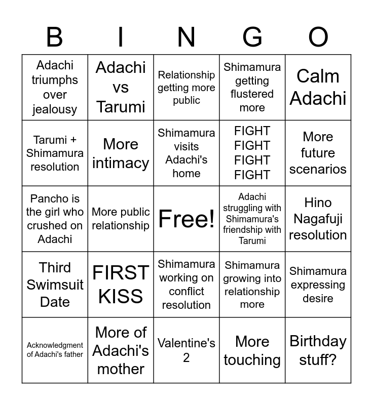 This bingo card has a free space and 24 words: FIRST KISS, More of Adachi's mother, Shimamura visits Adachi's home, Acknowledgment of Adachi's father, Calm Adachi, Adachi triumphs over jealousy, Tarumi + Shimamura resolution, Adachi vs Tarumi, Adachi struggling with Shimamura's friendship with Tarumi, Shimamura working on conflict resolution, FIGHT FIGHT FIGHT FIGHT, Pancho is the girl who crushed on Adachi, Shimamura growing into relationship more, Shimamura expressing desire, More intimacy, More touching, Hino Nagafuji resolution, Relationship getting more public, More future scenarios, More public relationship, Birthday stuff?, Third Swimsuit Date, Shimamura getting flustered more and Valentine's 2.