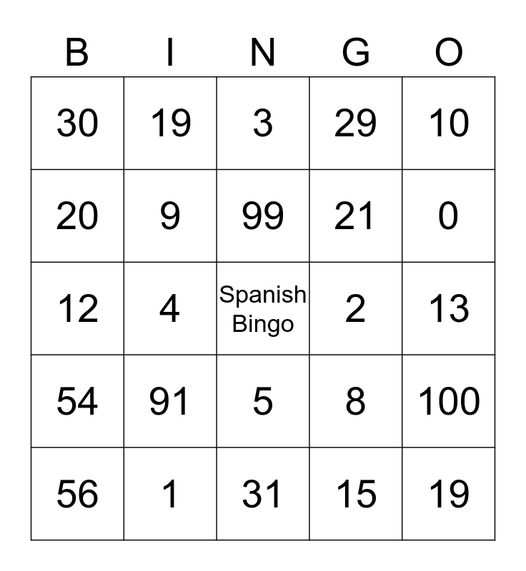 This bingo card has a free space and 24 words: 91, 1, 99, 56, 10, 30, 20, 19, 2, 5, 21, 12, 8, 100, 9, 15, 13, 3, 0, 4, 19, 54, 29 and 31.