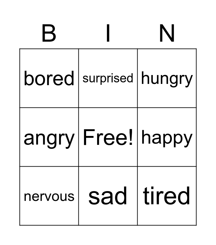 This bingo card has a free space and 8 words: happy, hungry, surprised, nervous, bored, tired, angry and sad.