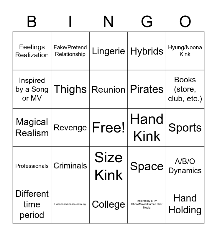 This bingo card has a free space and 24 words: Criminals, Possessiveness/Jealousy, Reunion, Different time period, Hyung/Noona Kink, Feelings Realization, Inspired by a Song or MV, Fake/Pretend Relationship, Hand Kink, Size Kink, Pirates, Magical Realism, Space, A/B/O Dynamics, Thighs, Inspired by a TV Show/Movie/Game/Other Media, Sports, Lingerie, Books (store, club, etc.), Revenge, Hand Holding, Professionals, Hybrids and College.