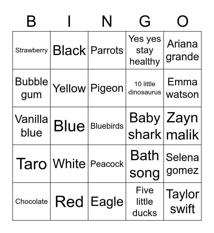 This bingo card has a free space and 24 words: Chocolate, White, Pigeon, Five little ducks, Ariana grande, Strawberry, Black, Parrots, Baby shark, Zayn malik, Vanilla blue, Yellow, Bath song, Selena gomez, Bubble gum, Red, Eagle, Yes yes stay healthy, Emma watson, Taro, Blue, Peacock, 10 little dinosaurus and Taylor swift.