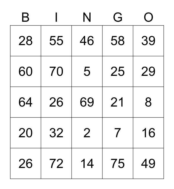 This bingo card has a free space and 24 words: 32, 72, 5, 26, 39, 28, 60, 55, 21, 2, 25, 64, 7, 16, 70, 75, 8, 46, 29, 26, 49, 20, 58 and 14.
