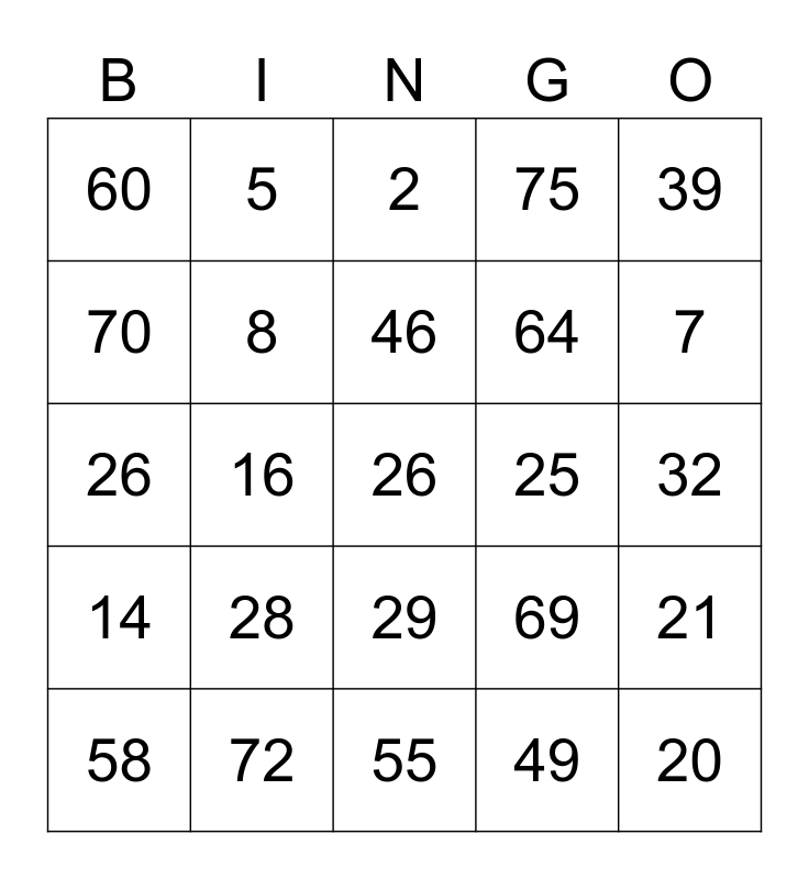 This bingo card has 25 words: 28, 55, 46, 58, 39, 60, 70, 5, 25, 29, 64, 26, 69, 21, 8, 20, 32, 2, 7, 16, 26, 72, 14, 75 and 49.