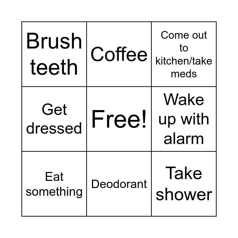 This bingo card has a free space and 8 words: Wake up with alarm, Come out to kitchen/take meds, Coffee, Eat something, Brush teeth, Take shower, Get dressed and Deodorant.