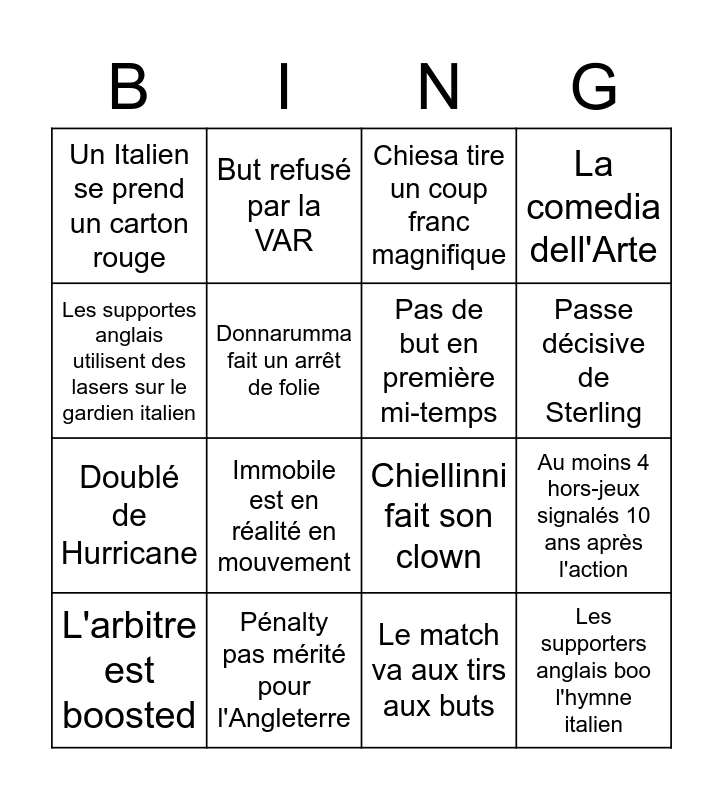 This bingo card has 16 words: Pénalty pas mérité pour l'Angleterre, Au moins 4 hors-jeux signalés 10 ans après l'action, Chiesa tire un coup franc magnifique, Un Italien se prend un carton rouge, Doublé de Hurricane, But refusé par la VAR, Chiellinni fait son clown, Le match va aux tirs aux buts, Les supportes anglais utilisent des lasers sur le gardien italien, Donnarumma fait un arrêt de folie, L'arbitre est boosted, La comedia dell'Arte, Immobile est en réalité en mouvement, Passe décisive de Sterling, Pas de but en première mi-temps and Les supporters anglais boo l'hymne italien.