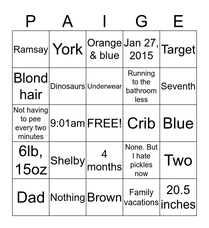 This bingo card has a free space and 24 words: Shelby, Nothing, Underwear, Dad, Target, Ramsay, Blond hair, York, Crib, 4 months, Running to the bathroom less, Not having to pee every two minutes, None. But I hate pickles now, Two, Dinosaurs, Family vacations, Blue, Orange & blue, Seventh, 9:01am, 20.5 inches, 6lb, 15oz, Jan 27, 2015 and Brown.
