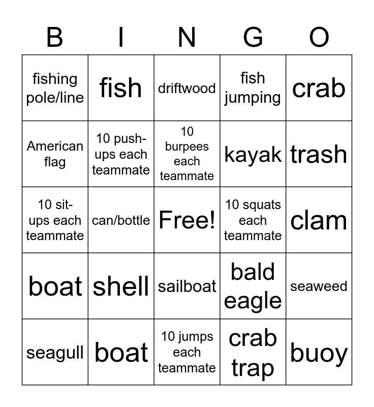 This bingo card has a free space and 24 words: shell, boat, 10 burpees each teammate, seagull, crab, fishing pole/line, American flag, fish, 10 squats each teammate, sailboat, kayak, 10 sit- ups each teammate, bald eagle, seaweed, 10 push-ups each teammate, crab trap, clam, driftwood, trash, can/bottle, buoy, boat, fish jumping and 10 jumps each teammate.