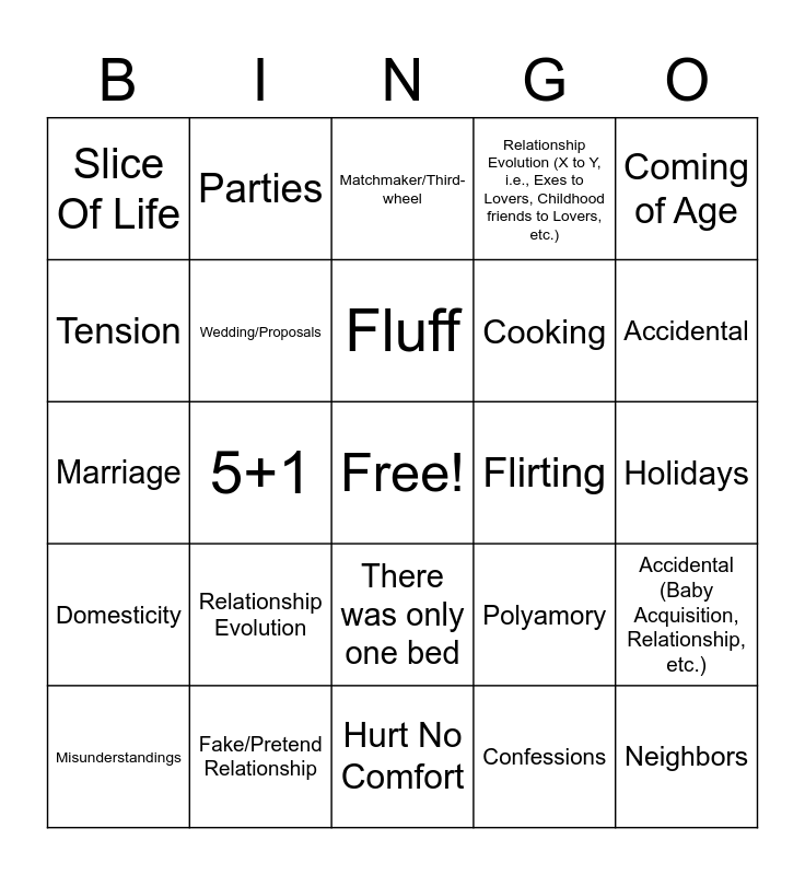 This bingo card has a free space and 24 words: Relationship Evolution, Fake/Pretend Relationship, Fluff, Misunderstandings, Coming of Age, Slice Of Life, Tension, Parties, Flirting, There was only one bed, Cooking, Marriage, Polyamory, Accidental (Baby Acquisition, Relationship, etc.), Wedding/Proposals, Confessions, Holidays, Matchmaker/Third-wheel, Accidental, 5+1, Neighbors, Domesticity, Relationship Evolution (X to Y, i.e., Exes to Lovers, Childhood friends to Lovers, etc.) and Hurt No Comfort.