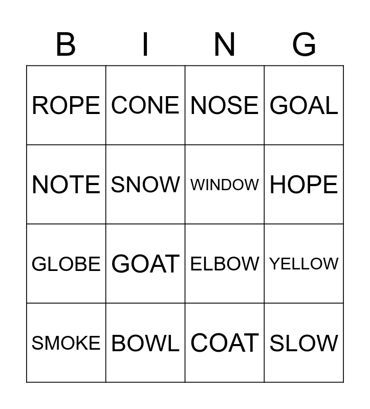 This bingo card has 17 words: COAT, SMOKE, NOSE, ROPE, GOAT, GOAL, YELLOW, WINDOW, HOPE, SNOW, BOWL, ELBOW, NOTE, CONE, GLOBE, COAL and SLOW.