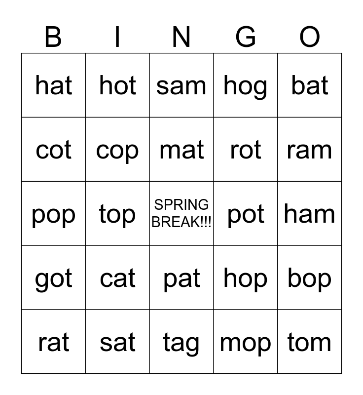 This bingo card has a free space and 24 words: cat, sat, mat, rat, bat, hat, cot, hot, pot, pat, rot, pop, hop, bop, cop, mop, ham, sam, ram, top, tom, got, hog and tag.