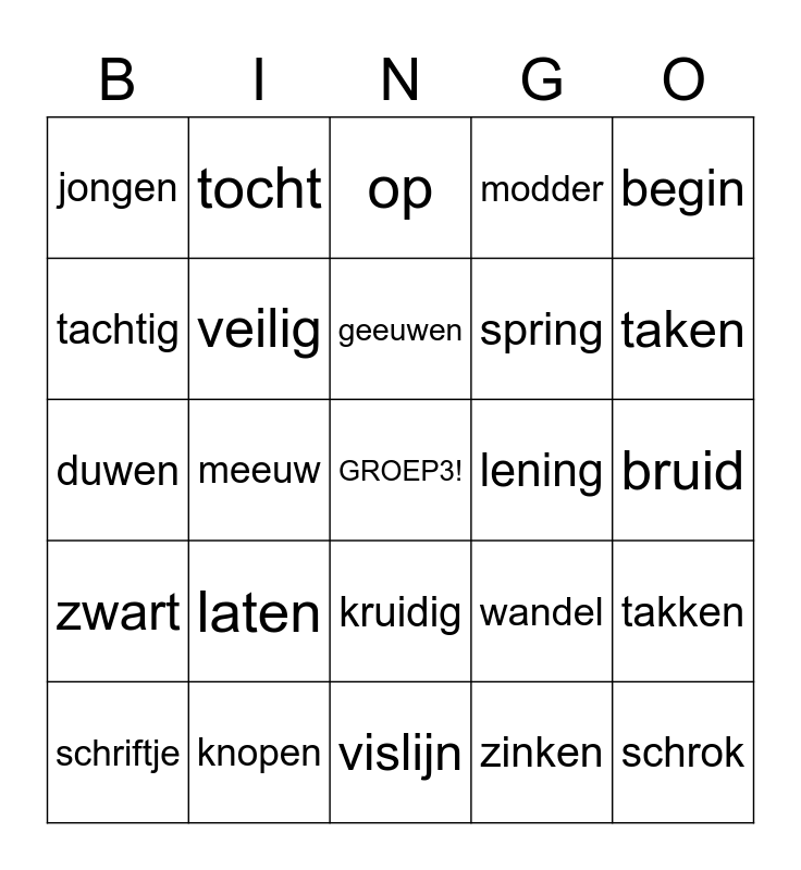 This bingo card has a free space and 24 words: laten, knopen, geeuwen, schriftje, begin, jongen, tachtig, tocht, lening, kruidig, spring, duwen, wandel, takken, veilig, zinken, bruid, op, taken, meeuw, schrok, zwart, modder and vislijn.