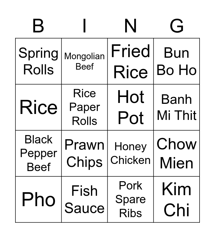This bingo card has 16 words: Fish Sauce, Chow Mien, Fried Rice, Spring Rolls, Black Pepper Beef, Mongolian Beef, Honey Chicken, Pork Spare Ribs, Rice, Rice Paper Rolls, Pho, Bun Bo Ho, Prawn Chips, Banh Mi Thit, Hot Pot and Kim Chi.