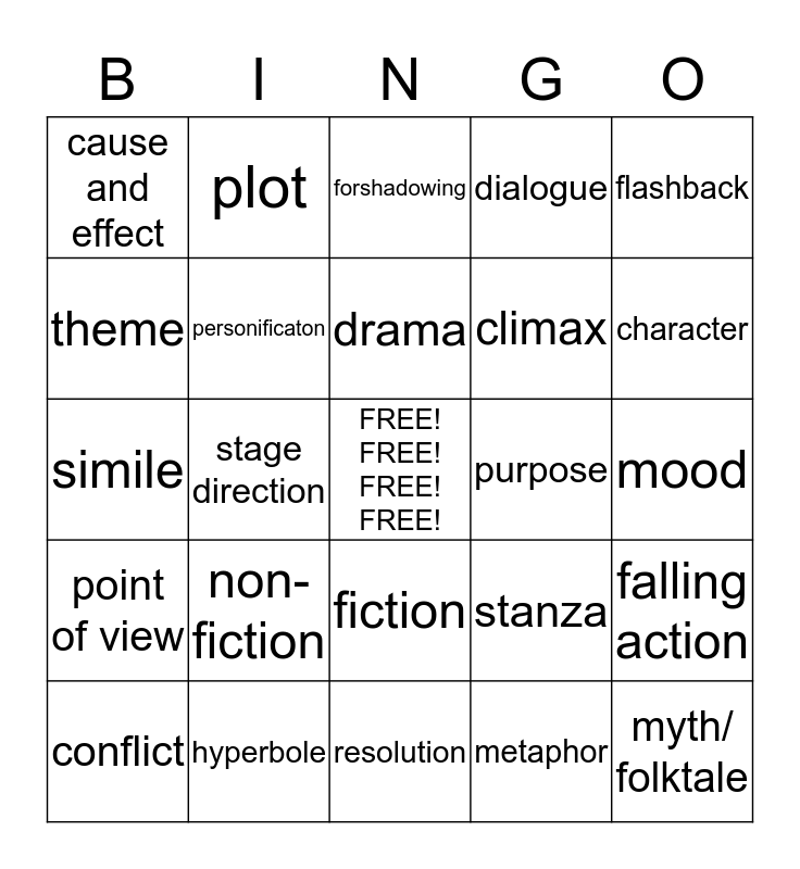 This bingo card has a free space and 24 words: non-fiction, hyperbole, drama, conflict, flashback, cause and effect, theme, plot, purpose, fiction, climax, simile, stanza, falling action, personificaton, metaphor, mood, forshadowing, character, stage direction, myth/ folktale, point of view, dialogue and resolution.