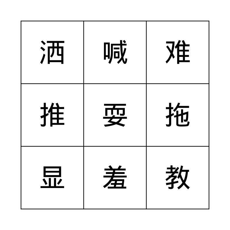 This bingo card has 11 words: 教, 羞, 耍, 显, 喊, 难, 拖, 肯, 推, 洒 and 无.